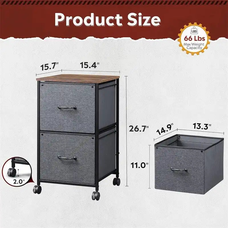 - Rolling on 4 wheels, this mobile file cabinet can fix or move around your home office freely. Built-in brakes on front 2 casters to keep it in position and add stability. Unique fabric drawer design makes it only weigh 22 lbs. and light to move.