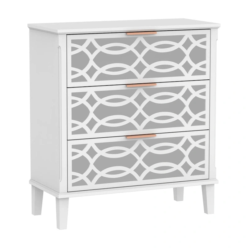 Modern Nightstand 3 drawer dresser uses white and decorative mirror to bring your home luxury and elegant charm. The pattern framed decorative mirror will add value to your home