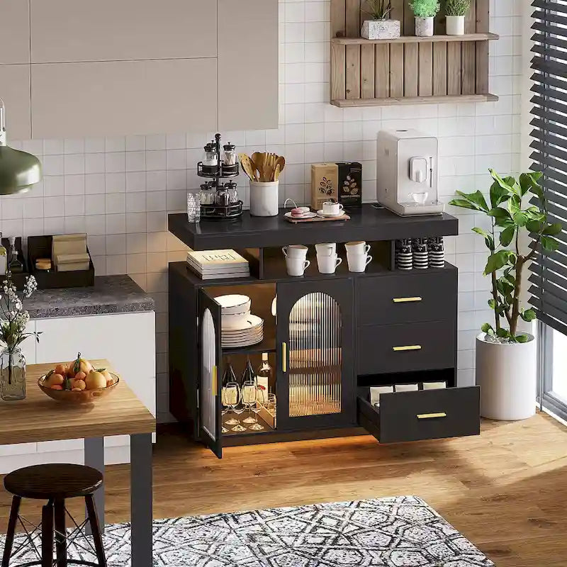 - Featuring 3 drawers on the side and 2 cabinet doors on the bottom, the buffet table can provide large storage space that can hold some wine bottles, seasoning cans, cutlery, food, pots and pans, etc. It keeps your kitchen and dining room clean and tidy.