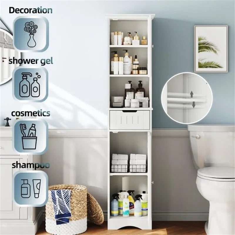 - High bathroom cabinet free-standing design with 2 doors and adjustable shelves to meet storage needs and item sizes in both high and low areas. Slim bathroom storage cabinets have barrier-free open storage space, and small drawers with grooves can help store clutter without bending, and let the countertop say goodbye to dirt and clutter.