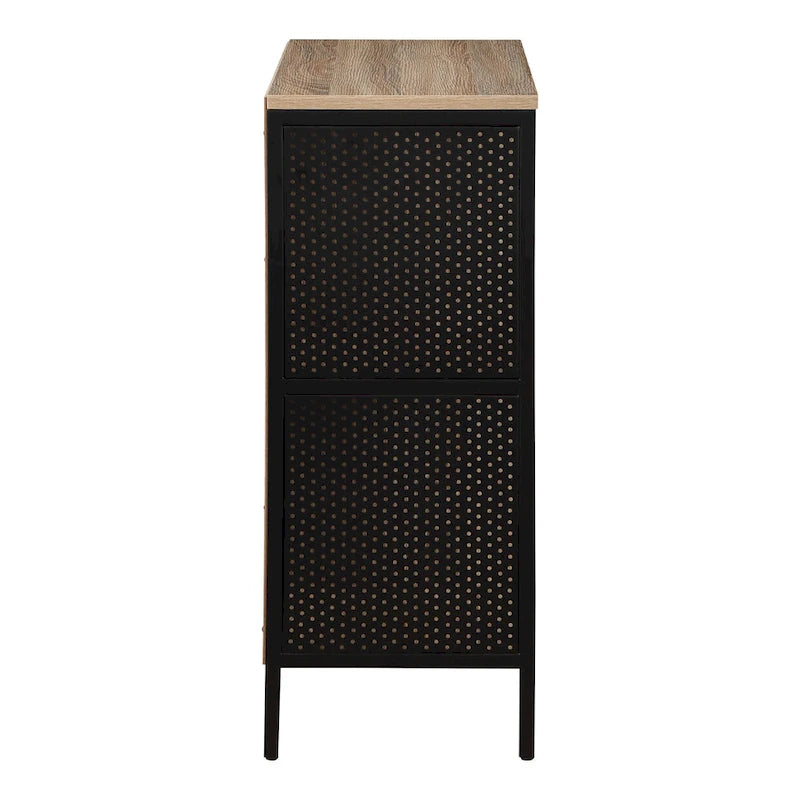 Solve your practical storage solution in style with our wood and metal storage bookshelf! With 4, 13 x 13 cube shelves, this bookshelf is the perfect size for storing books or plastic tubs. The woodgrain finish and perforated metal sides give it a modern industrial style and that will elevate any room and the sturdy metal frame with center support will add long-lasting durability and strength.