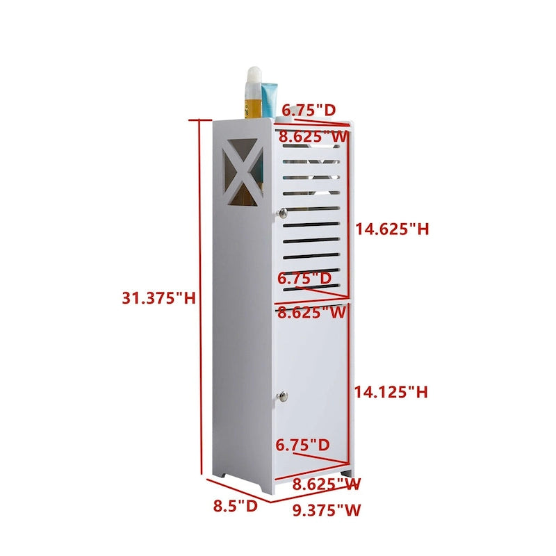 Give your bathroom classic style with this clean-lined cabinet in a solid white finish that blends effortlessly into your space. The two cabinets are perfect for all your bathroom essentials: towels, toilet paper and more, while the upper interior shelf offers tight organization.