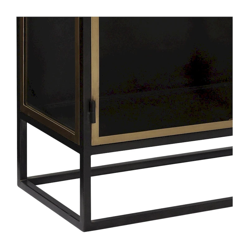 A shadowbox-inspired 2- Door sideboard, featuring a gunmetal finished frame and antique brass accents for contrast. Our handsome modern industrial sideboard is ideal for displaying prized pieces.