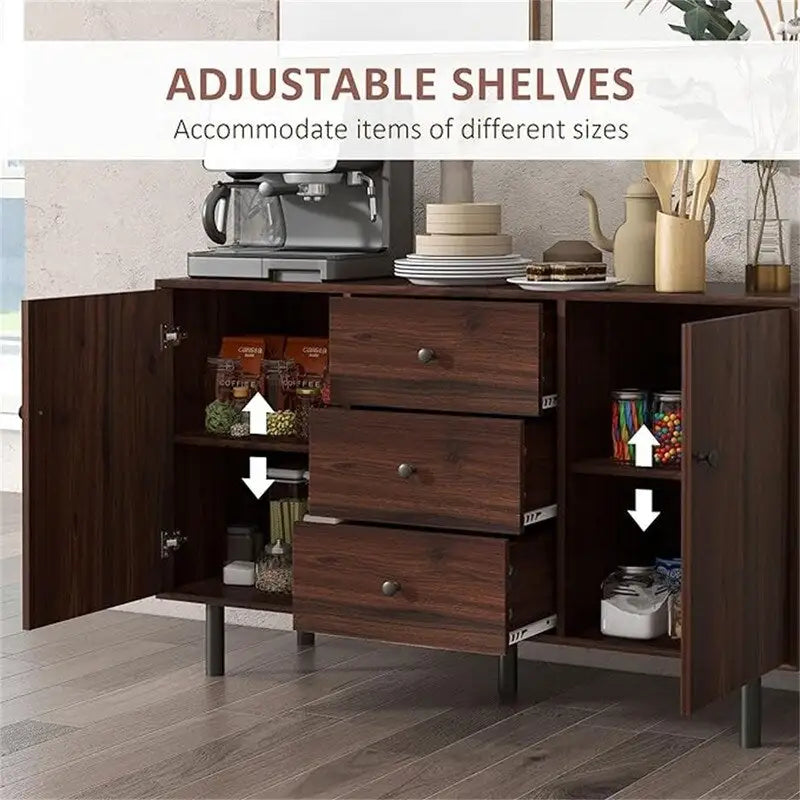 - Storage Solution: Featuring two enclosed cupboards on both sides and three handy drawers in the middle, this console cabinet offers spacious space to store all your daily items, such as utensils, dry goods, dishes, or other accessories. The shelves behind the door can be adjusted up or down to maximize storage space..