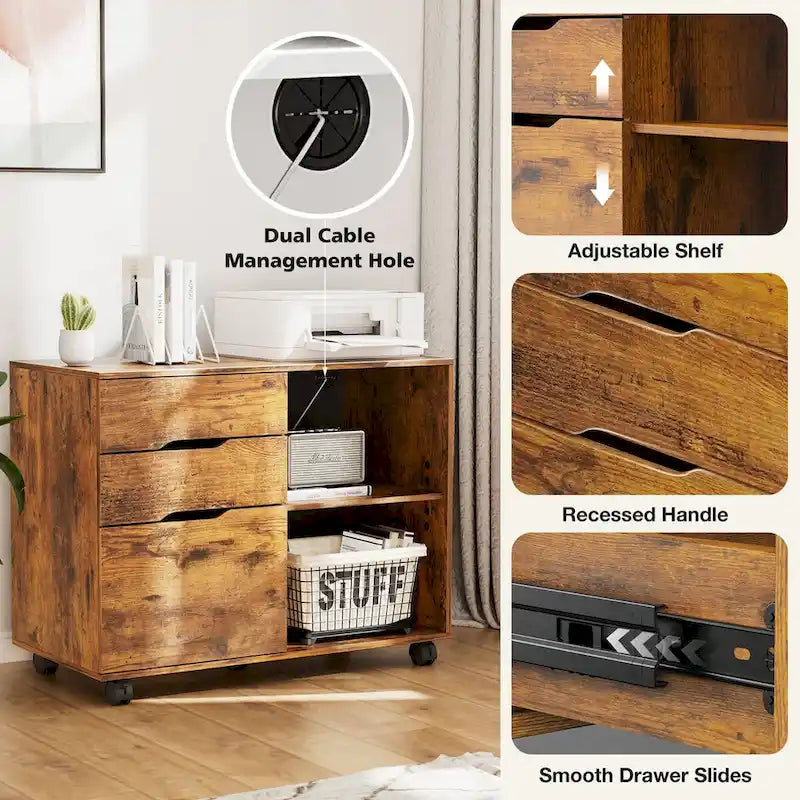 Mobile Lateral File Cabinet & Printer Stand with 3 Drawers and 2 Open Shelves
