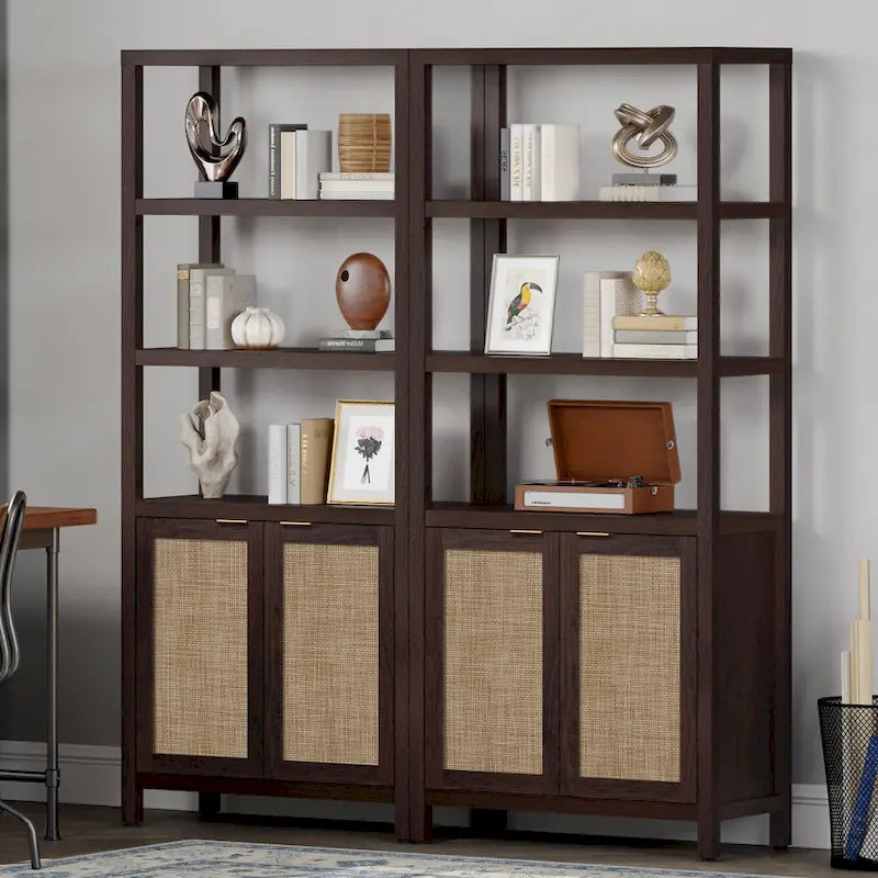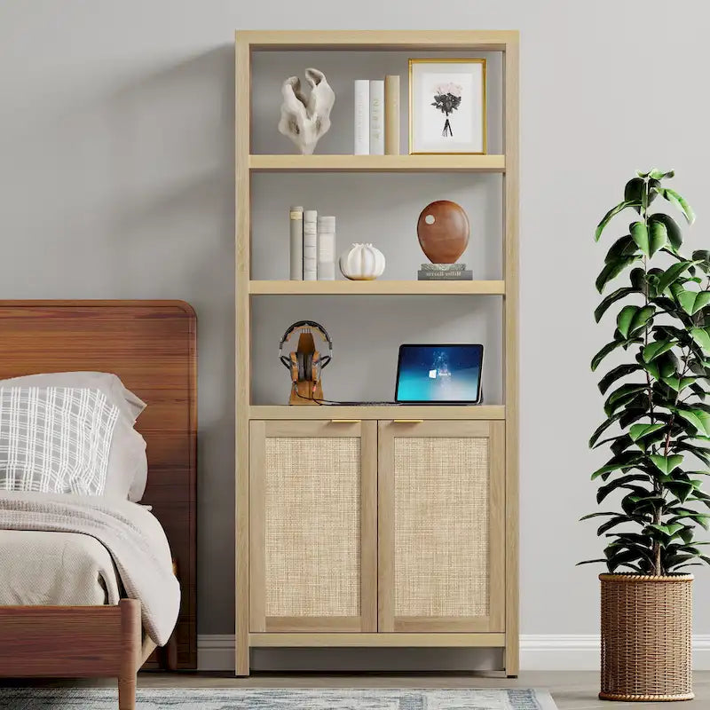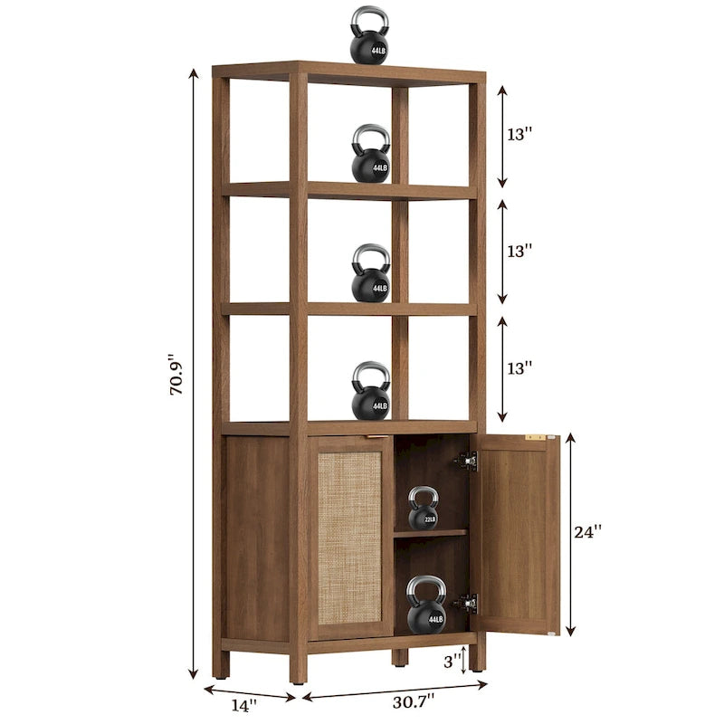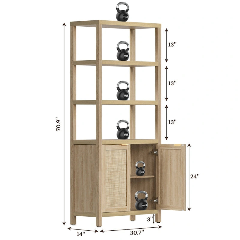 Product Description:The 5-tier rattan bookshelf boho bookcase with doors is a remarkable fusion of style and functionality.With its tall design and premium thicken MDF board construction, this bookshelf offers generous storage space for books, decorative items, and more. It serves not only as a versatile bookshelf that can be placed in the bedroom, living room, kitchen, bathroom, office, warehouses, etc., but also as a standing display shelf, plant stand, kitchen rack, or bathroom storage rack.The intricate rattan details add a unique boho-inspired touch, making it a captivating piece in any room. The farmhouse-style design of this tall and narrow bookshelf makes it an ideal fit for smaller spaces or tight corners without compromising on interior space. It seamlessly blends into farmhouse or boho-style decor, serving as a perfect addition.Crafted with durability and sturdiness in mind, this bookcase guarantees long-lasting beauty and functionality within your home for years to come.Specifications:Number of Shelves: 5Product Dimensions: 13.98D x 30.71W x 70.87HStyle: ContemporaryProduct Care Instructions: Wipe with Damp ClothSize: 1 Pack BookshelfAssembly Required: YesItem Weight: 79 PoundsFurniture Finish: Engineered WoodInstallation Type: Freestanding