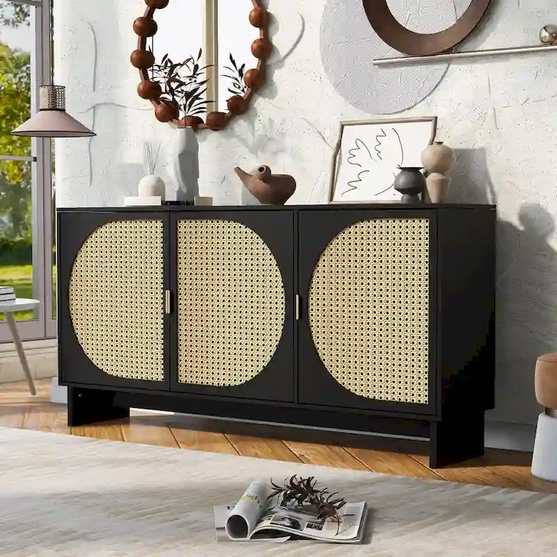 High-end minimalist cabinet with rattan doors is a stunning piece of furniture that excels in both style and functionality. Made from premium quality PE rattan, the intricate weaving pattern adds an element of texture and visual interest to the piece. Furthermore, equipped with spacious inner space and adjustable shelves, it provides ample storage for various items, keeping the living space organized and clutter-free.Highlights
