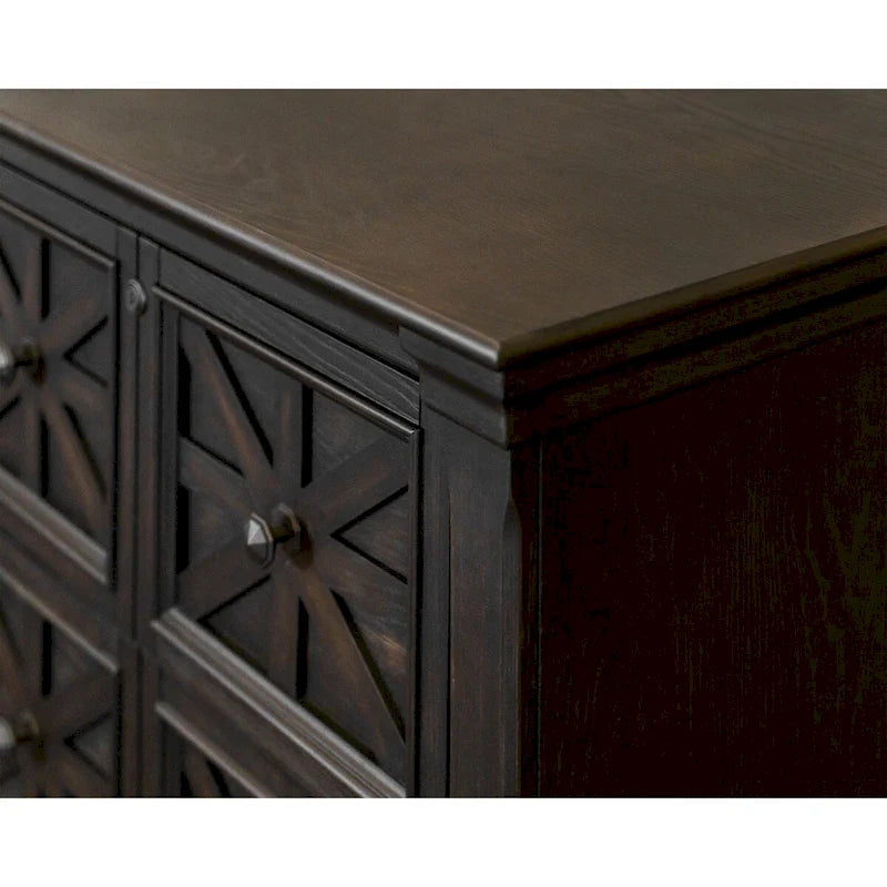 Kingston emanates an air of an English country manor. Dark chocolate rub through finish is softly worn to enhance the wood and give a naturally aged look to the collection. Criss-cross detail adds interest and dimension to drawer fronts and panels, while mottled antique hardware enhance the look of the group.