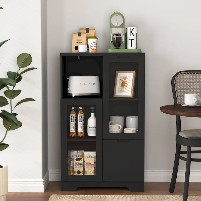 Multipurpose cabinet offers plenty of functional storage. Looks great in your living room, entryway, bedroom ,dining room, condo or office. Features 2 glass doors that open to two adjustable shelves for versatile storage,and 2 storage compartment